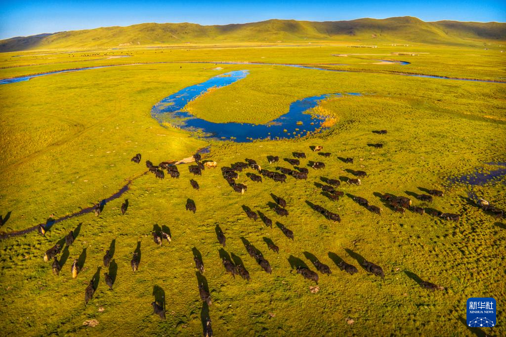 9月13日,在四川阿坝县,牧民赶着牛群牧归(无人机照片)。