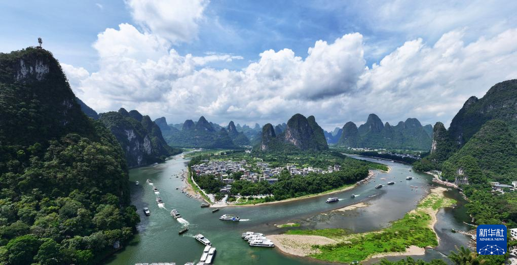 9月13日,在漓江广西桂林市阳朔县兴坪镇段,游人游览漓江两岸风光(无人机全景照片)。