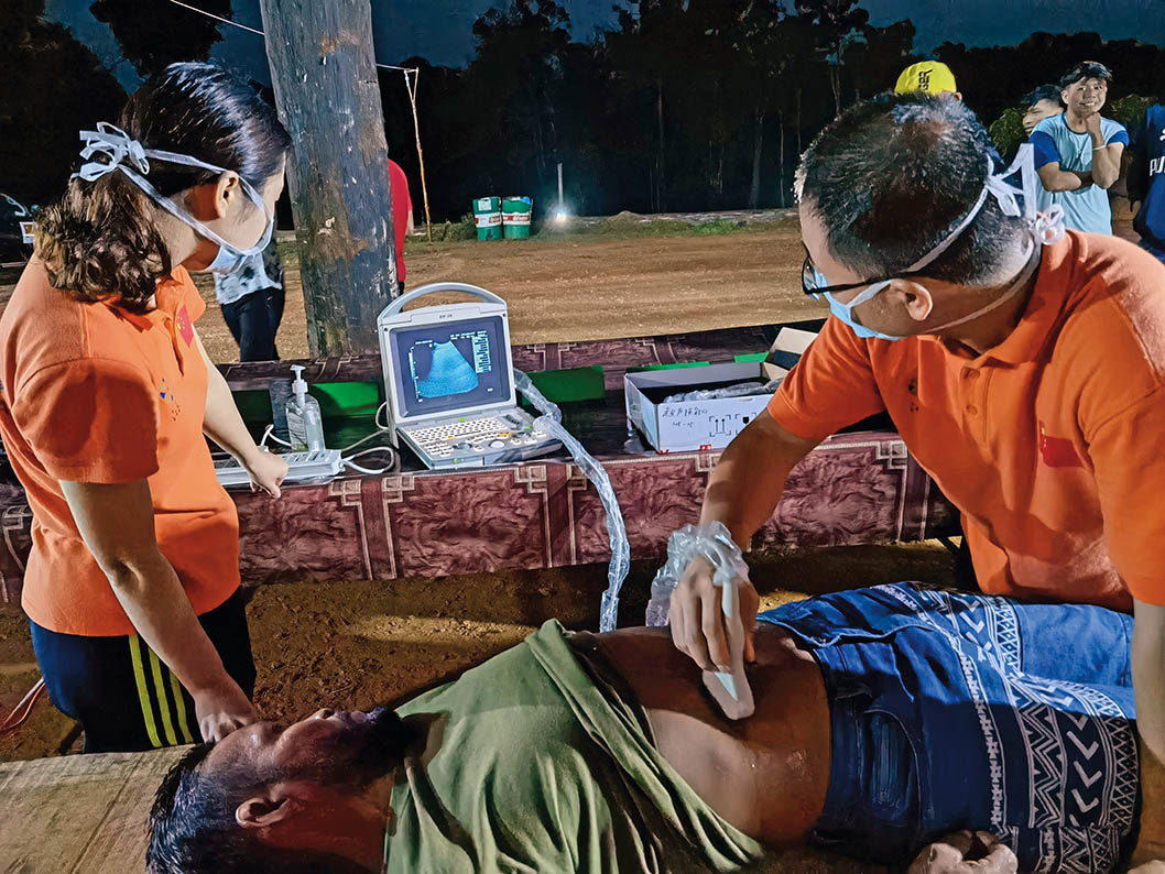 2022年2月12日,中国医疗队在圭亚那中资企业荣安公司林区驻地为工人做检查