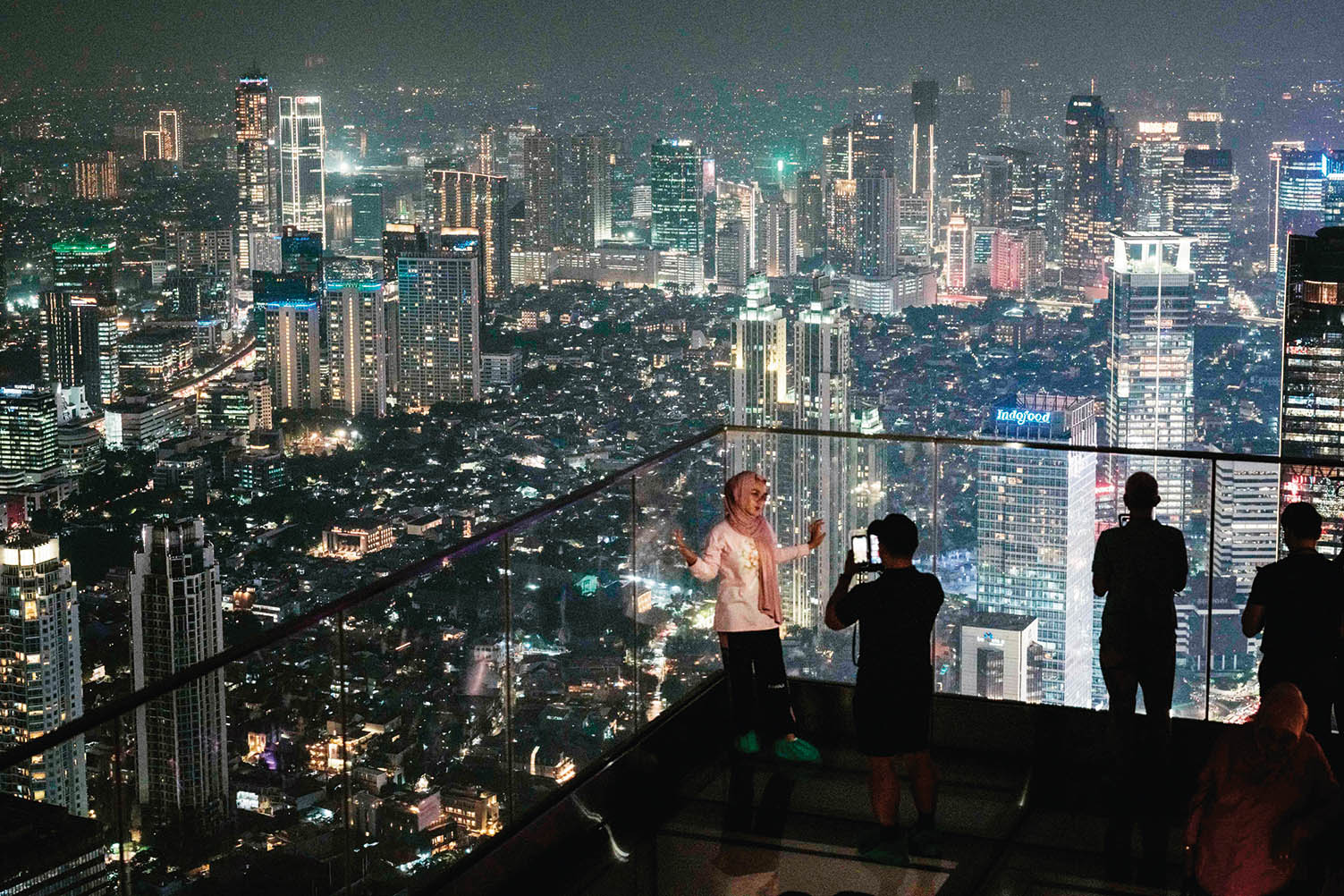 7月24日,人们在印度尼西亚雅加达一栋高楼上欣赏城市风光