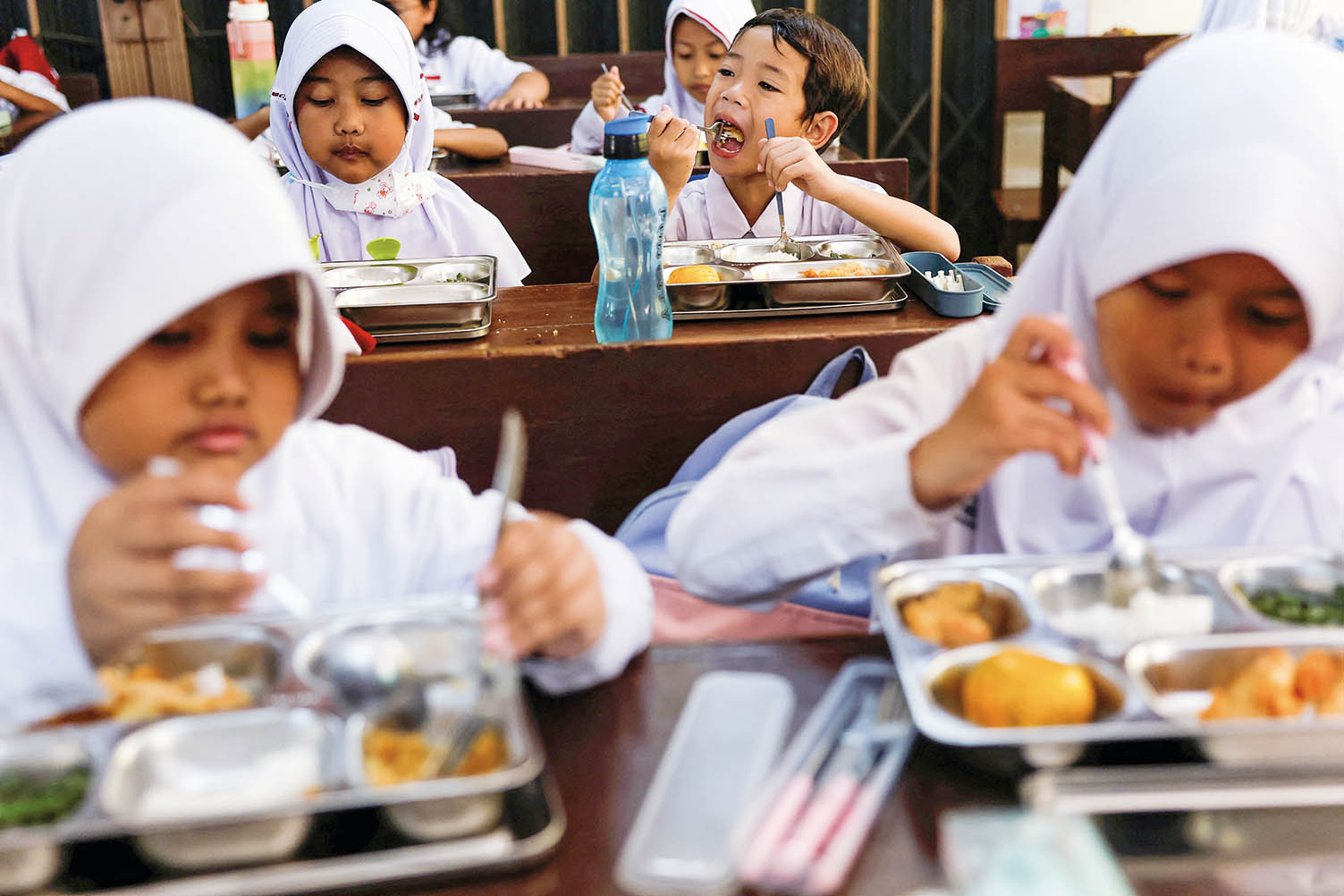 1月6日,学生在印度尼西亚雅加达的学校里吃营养餐。印度尼西亚政府2025年1月6日正式启动免费营养餐计划