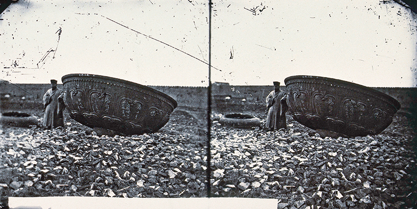 如果汤姆森早15年到此,他将望见一座高78米、九层八面的宝塔——明朝皇帝朱棣为纪念其母亲而建的大报恩寺琉璃塔。但汤姆森看到的只有废墟。1856年,战火让寺塔尽毁,留下照片中这只原置于塔顶、收集雨水的承露盘。
