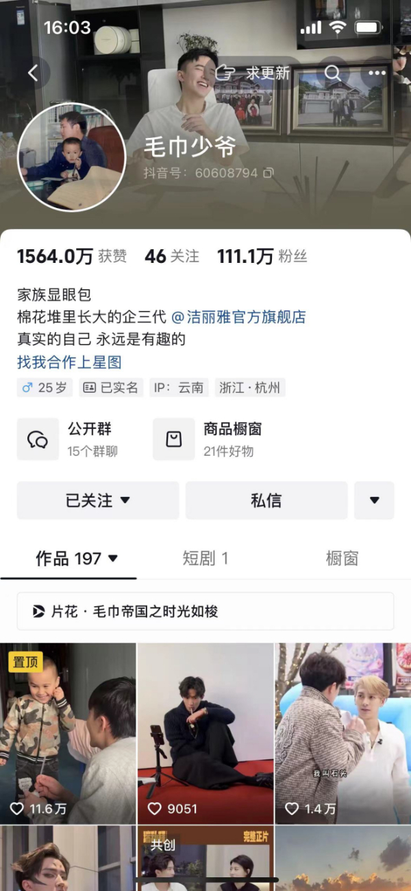 石展承“毛巾少爷”抖音账号主页