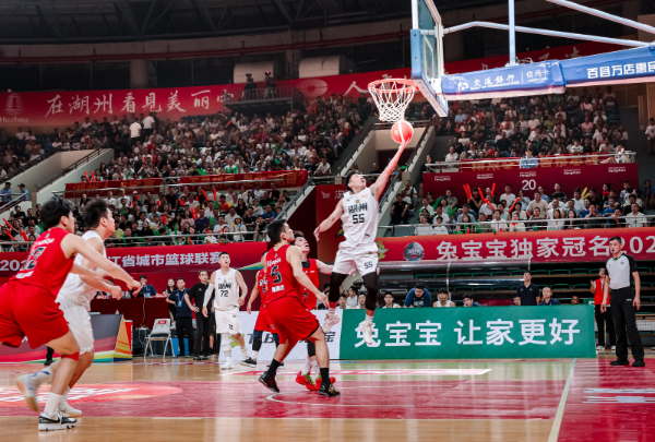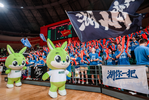 新华网北京9月18日电(钟雨泉)9月14日2025浙江省城市篮球联赛(简称“浙BA”)的比赛现场,湖州队队员正全力迎战金华队。观众席上,兔宝宝员工身着整齐文化衫,手持加油手幅,用充满地域特色的口号为球队呐喊助威。而在赛场上,同样身着印有兔宝宝元素球衣的湖州队球员们正为了胜利全力拼搏。