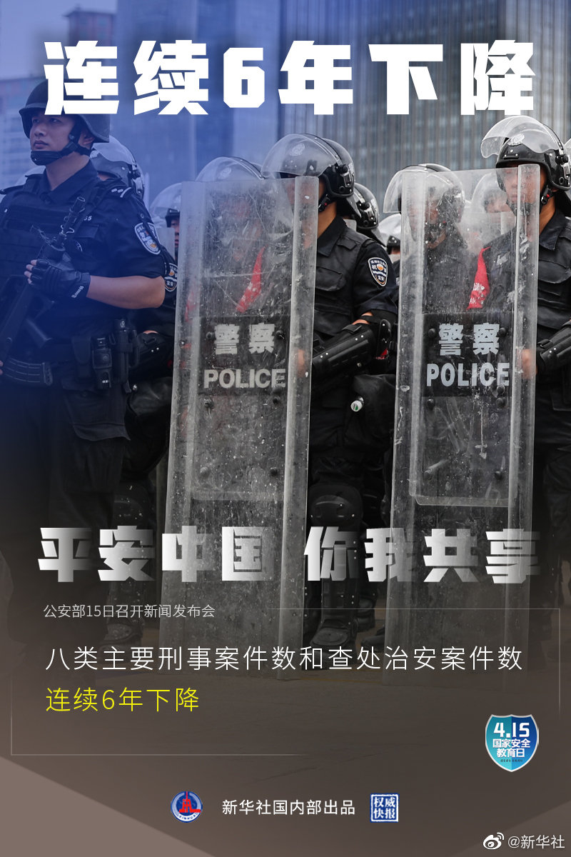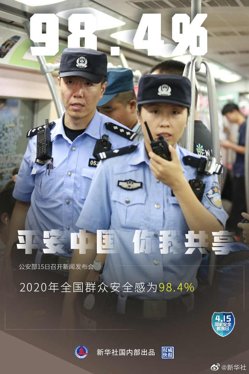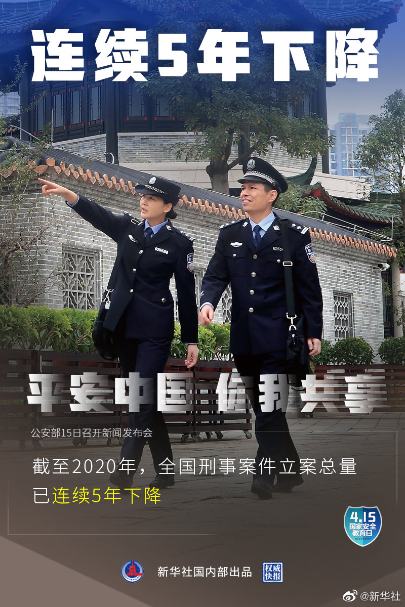 4月15日是第六個(gè)全民國家安全教育日,公安部15日召開新聞發(fā)布會(huì)介紹:2020年全國群眾安全感為98.4%,全國居民對(duì)社會(huì)治安滿意度達(dá)83.6%。截至2020年,全國刑事案件立案總量連續(xù)5年下降,八類主要刑事案件數(shù)和查處治安案件數(shù)連續(xù)6年下降。(記者熊豐,海報(bào)設(shè)計(jì)張晨光)
