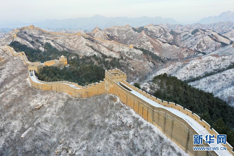 這是3月1日在河北承德境內拍攝的金山嶺長城雪景(無人機照片)。新華社發(周萬平 攝)