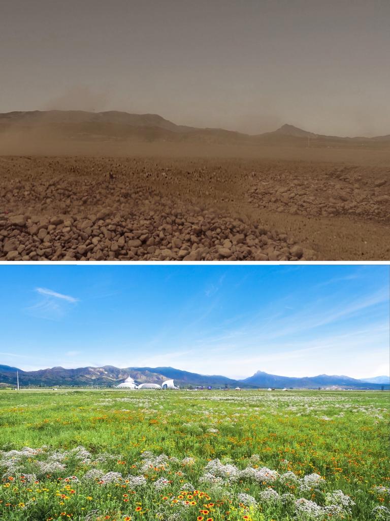 拼版照片:上图为2012年6月拍摄的生态修复前的内蒙古呼和浩特市近3万亩荒石滩;下图为2017年8月拍摄的生态修复后的敕勒川生态草原观光带核心区。新华社发