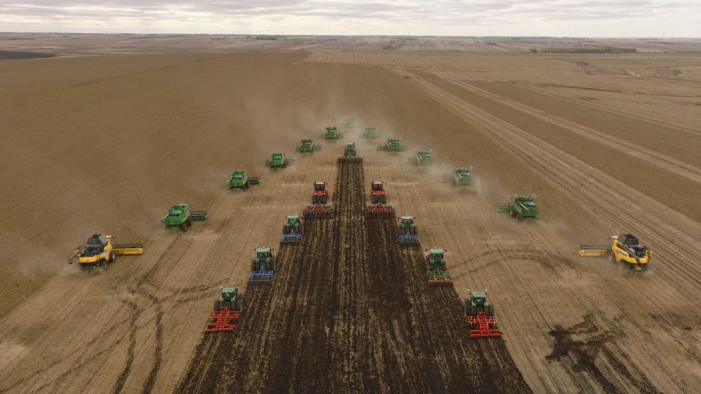 深秋的黑龙江省黑河市爱辉区罕达汽镇,大豆收获与整地无缝衔接,联合收割机在田间往返穿梭,金色豆田在阳光下熠熠生辉,种植户们脸上洋溢着丰收的喜悦。