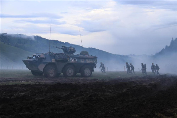 ????陸軍第83集團(tuán)軍某旅紅一連官兵實(shí)兵利用戰(zhàn)車掩護(hù)向“敵”陣地發(fā)起沖鋒。新華社發(fā)(張?jiān)鰩r 攝)