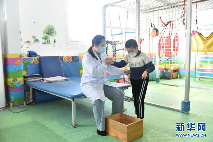 在哈爾濱博能中醫(yī)門診部,劉雨晴為腦癱兒童進行康復(fù)訓(xùn)練(2月2日攝)。