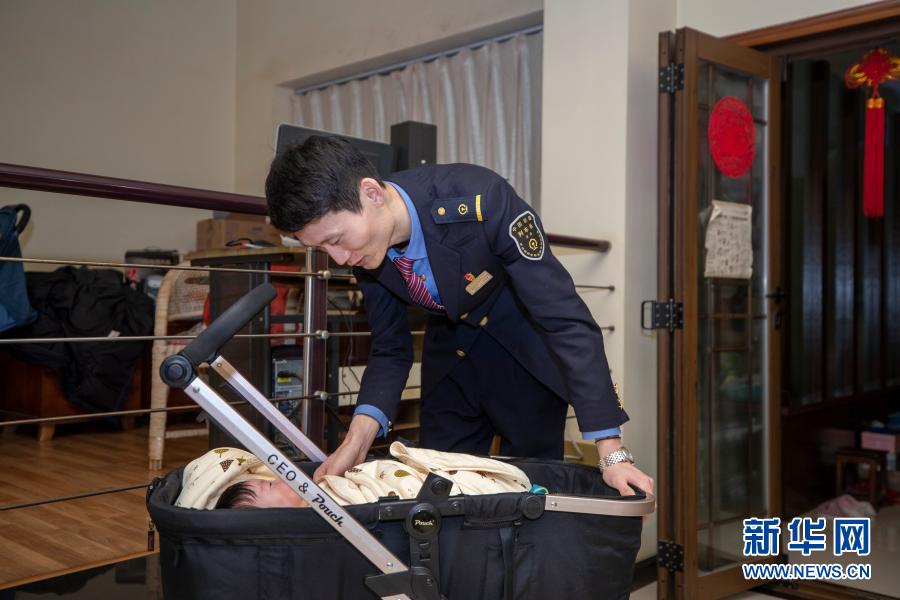 2月10日,在重慶市渝中區(qū)家中,付寶印回家后逗兒子玩耍。新華社記者 黃偉 攝
