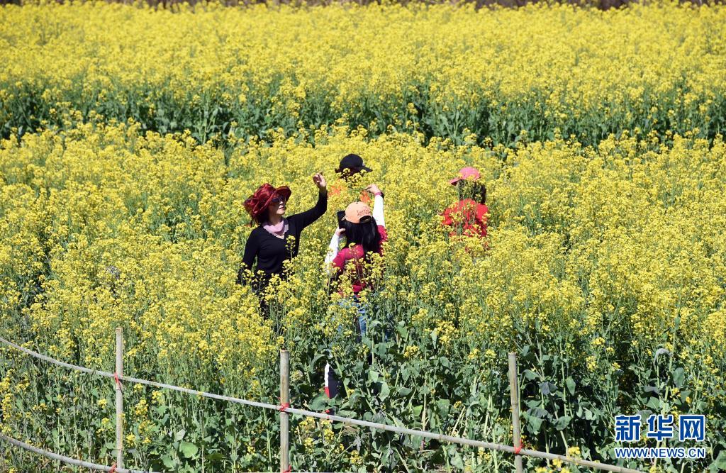 3月26日,游客在黃山市徽州區靈山村的花海中踏青游覽。