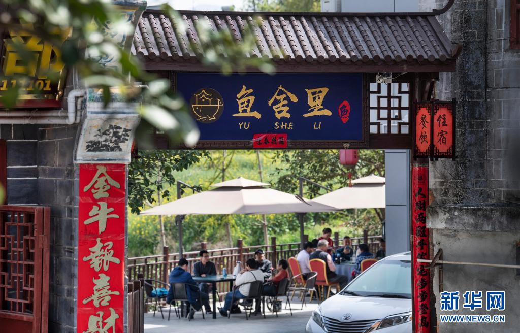 游人在流水鎮的古街上體驗農家樂(3月27日攝)。