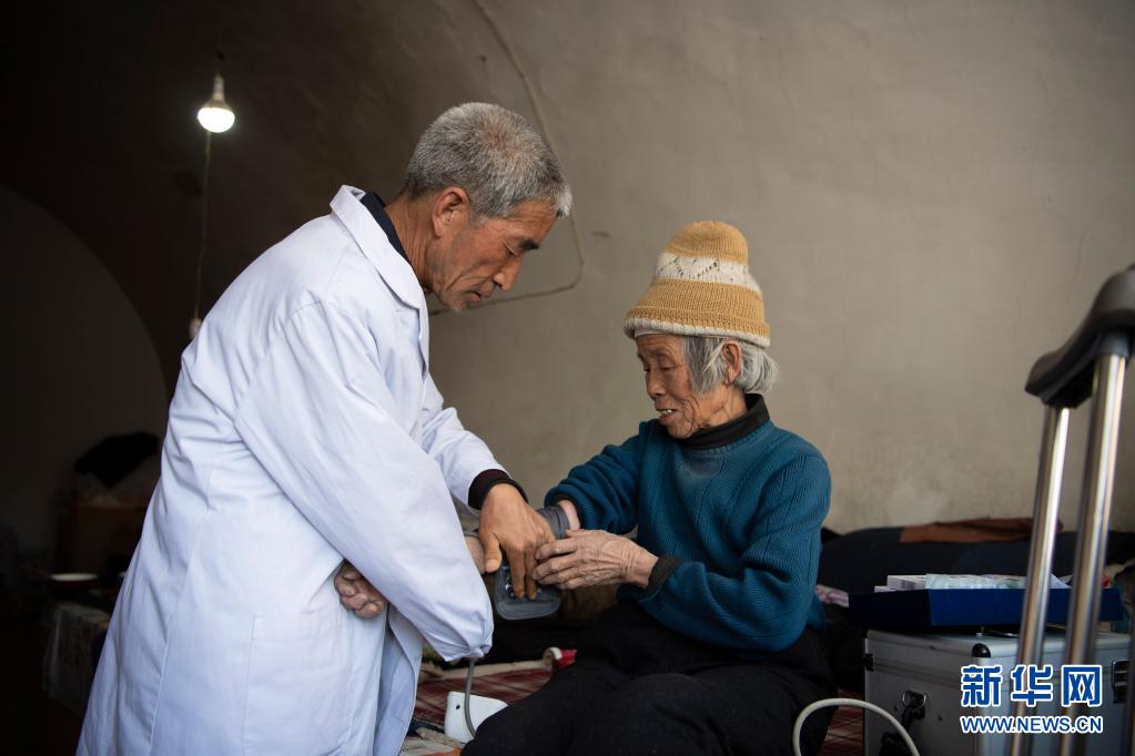 在山西省呂梁市石樓縣鐵頭村張家灣自然村,張尚保(左)在為村民測(cè)量血壓(3月23日攝)。新華社記者 楊晨光 攝