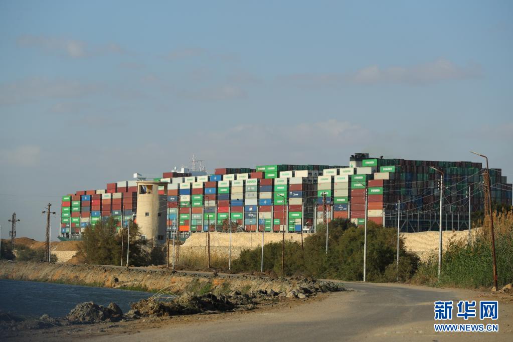 這是3月29日拍攝的移動至埃及蘇伊士運河正常航道上的重型貨輪。
