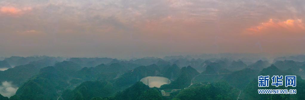 3月30日拍攝的朝霞中的“中國(guó)天眼”全景(維護(hù)保養(yǎng)期間拍攝,無人機(jī)照片)。