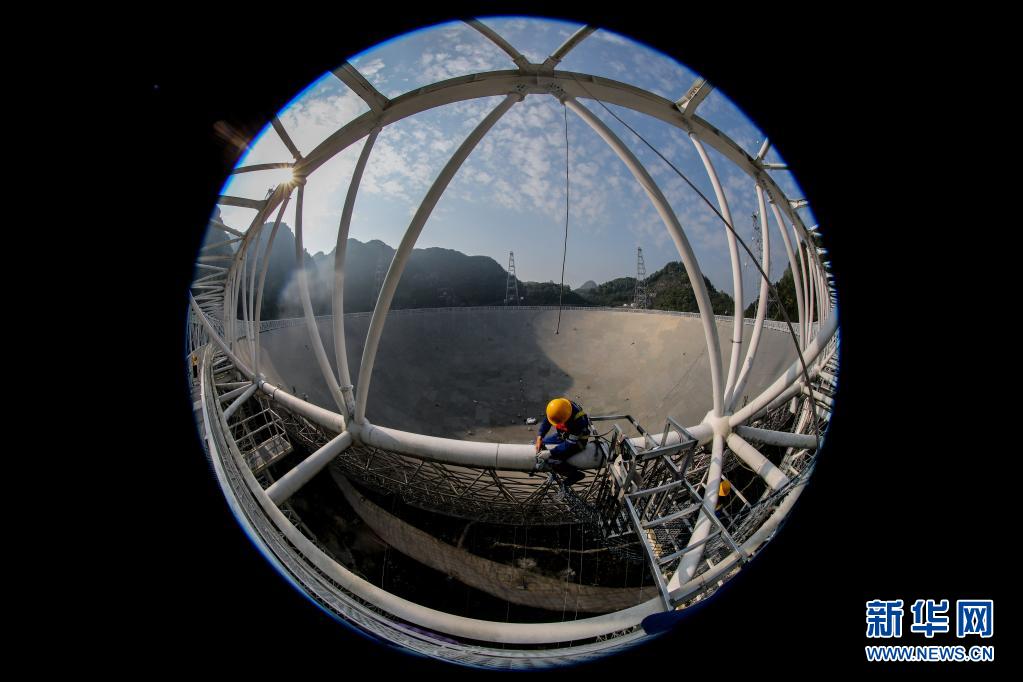 3月29日,工作人員對FAST圈梁進行維護(維護保養期間魚眼鏡頭拍攝)。