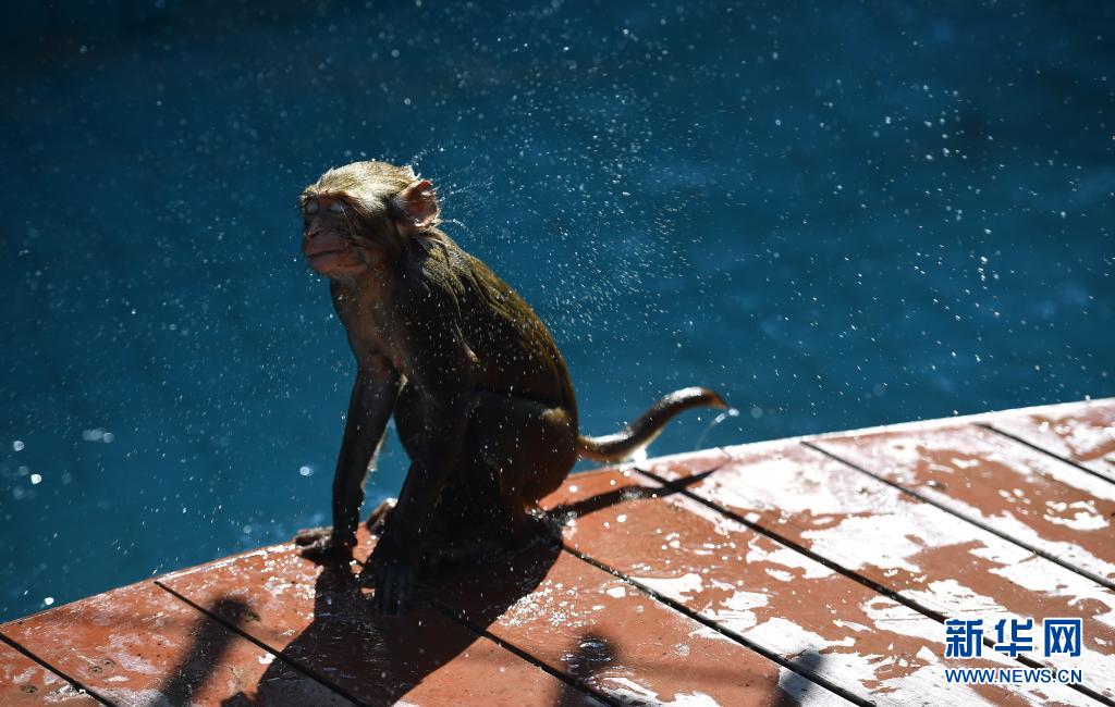 4月4日,南灣猴島保護區(qū)里的獼猴在上岸后甩去身上的水。