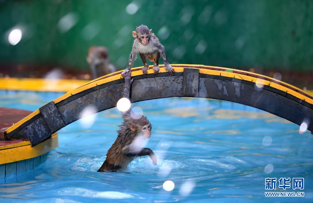 4月4日,獼猴在南灣猴島保護(hù)區(qū)里戲水。