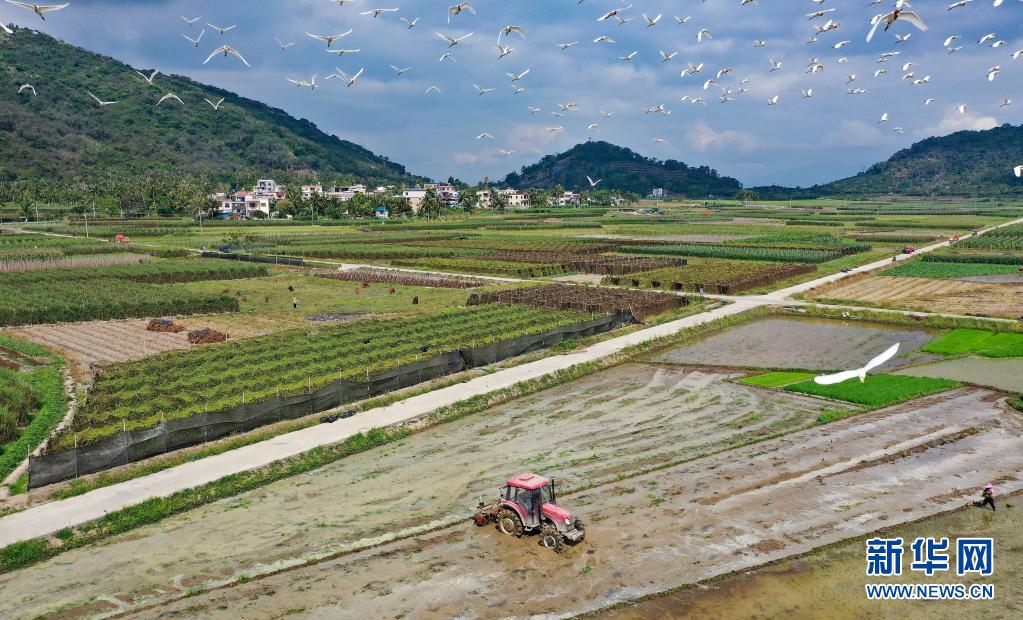 4月5日,海南省陵水黎族自治縣光坡鎮(zhèn)的農(nóng)民在田間勞作(無人機(jī)照片)。