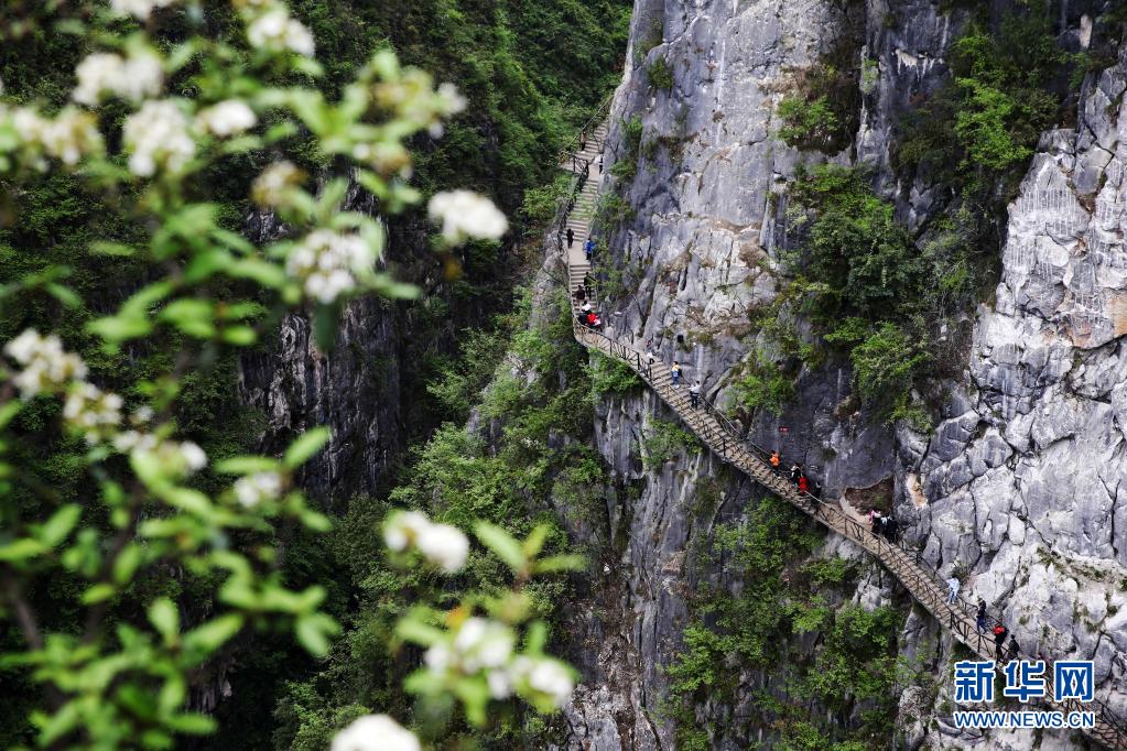 4月5日,游客在重慶市黔江區(qū)城市大峽谷景區(qū)懸崖棧道游玩。