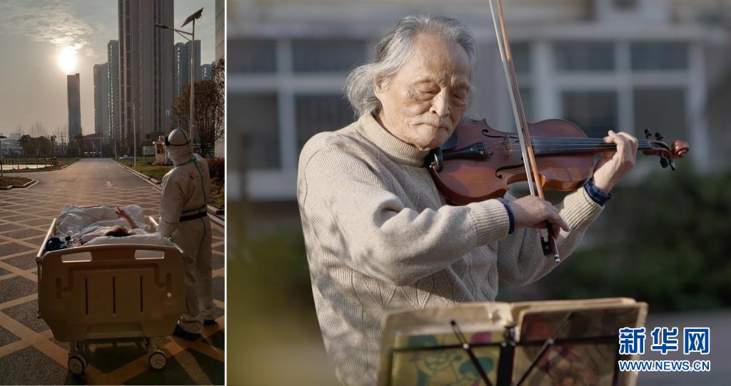 這是一張拼版照片,左圖為:2020年3月5日傍晚,在湖北省武漢大學(xué)人民醫(yī)院東院,復(fù)旦大學(xué)附屬中山醫(yī)院支援湖北醫(yī)療隊醫(yī)生在護送患者王欣做CT的途中停下,讓住院近一個月的老人欣賞久違的日落(甘俊超 攝);右圖為:3月24日,“看夕陽的老人”王欣在東西湖區(qū)園藝花城小區(qū)內(nèi)拉小提琴(新華社記者熊琦攝)。新華社發(fā)