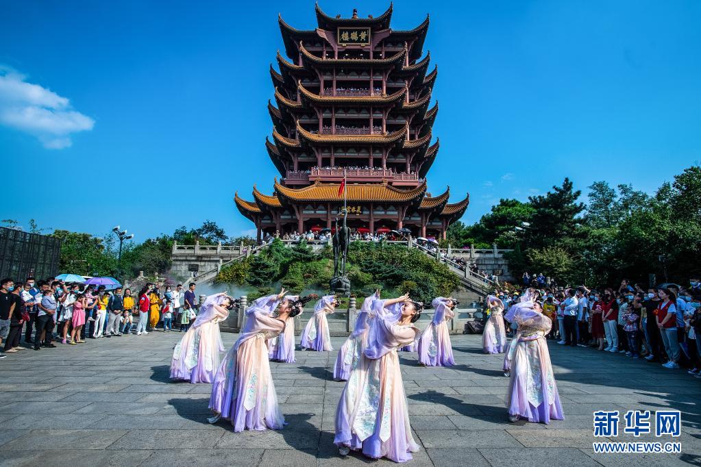 2020年10月1日,游客在武漢黃鶴樓景區觀看演出。新華社記者 肖藝九 攝