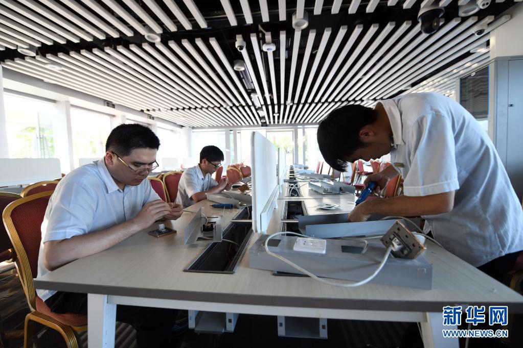 4月10日,工作人員在安裝新聞中心網絡設施。