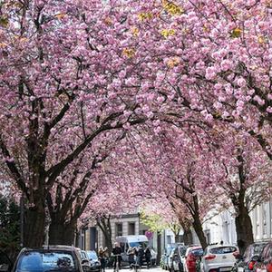 近日,德國西部城市波恩老城區的櫻花盛開,吸引了許多游人前來觀賞。