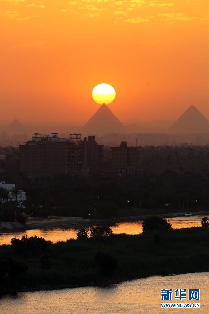 這是4月14日從埃及開羅拍攝的吉薩金字塔群日落景色。新華社記者 隋先凱 攝