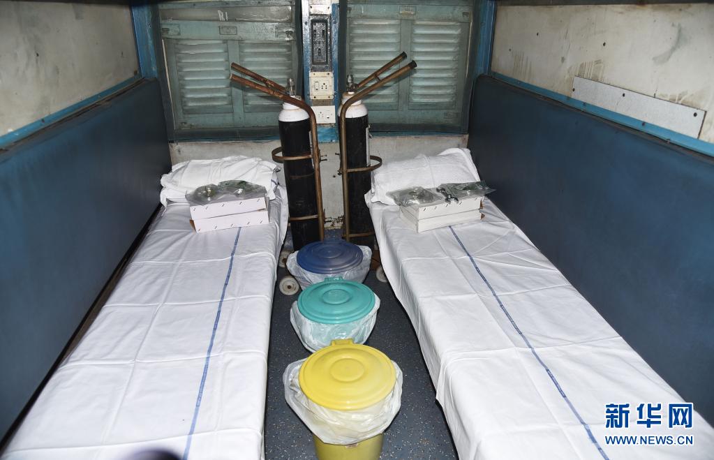 這是5月5日在印度高哈蒂火車站拍攝的改造成臨時病房的列車廂。