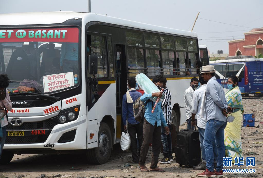 5月5日,印度比哈爾邦宣布實施封鎖措施后,人們在印度巴特那汽車站準備乘坐巴士返回家鄉(xiāng)。
