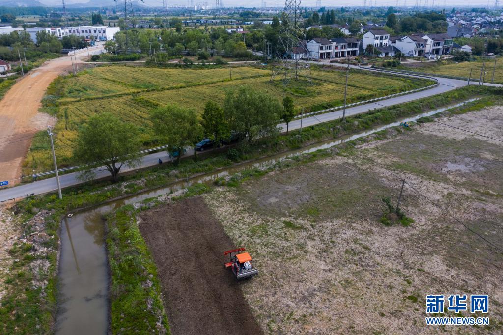 在東林鎮(zhèn)保永村,種植戶操作旋耕機(jī)耕地,準(zhǔn)備播種水稻(5月7日攝,無(wú)人機(jī)照片)。