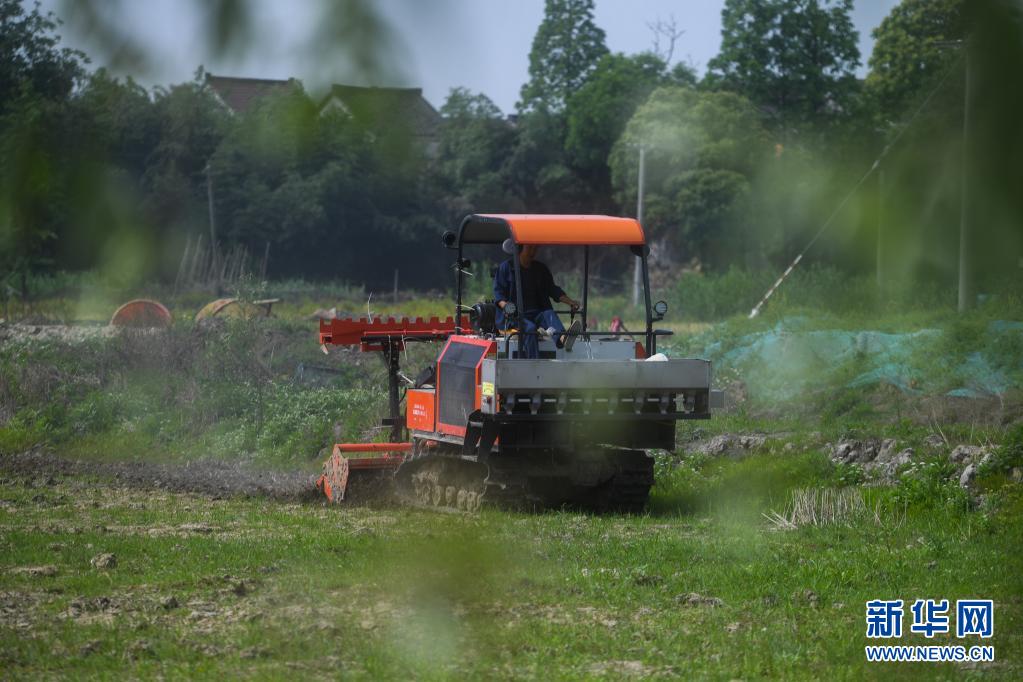 在東林鎮保永村,種植戶操作旋耕機耕地,準備播種水稻(5月7日攝)。