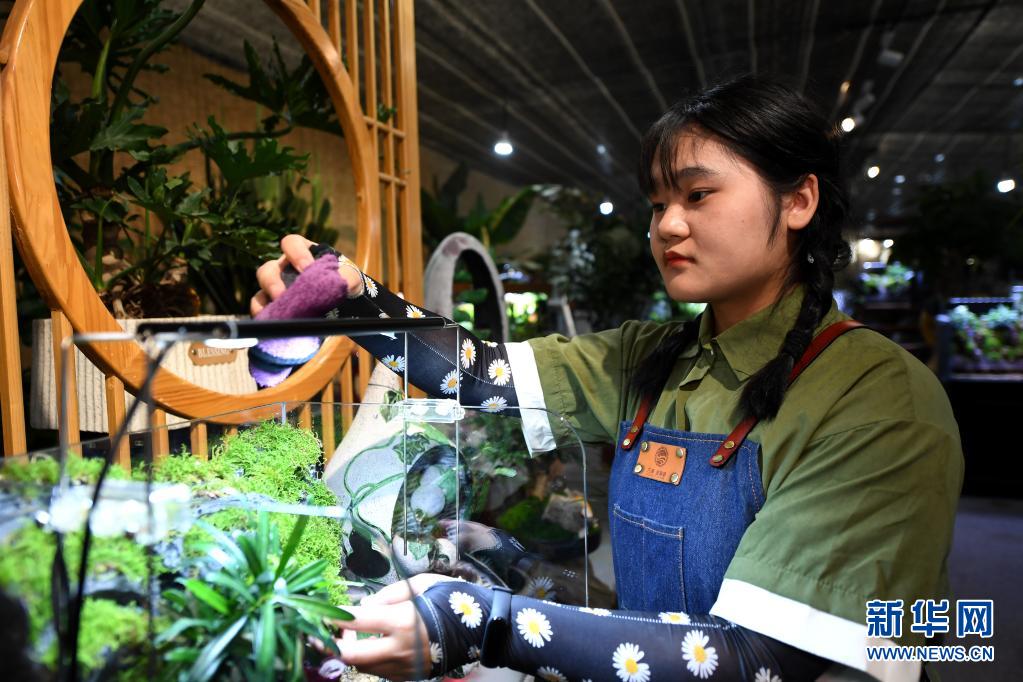 5月7日,在秦嶺花世界現代農業園區,花藝師韓佳馨在對盆景進行清潔養護。