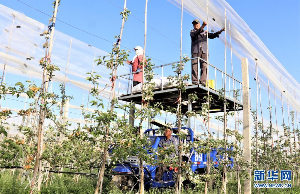 5月9日,在甘肅省平涼市靜寧縣城川鎮一蘋果有機示范園里,工人在為果園搭建防雹網。