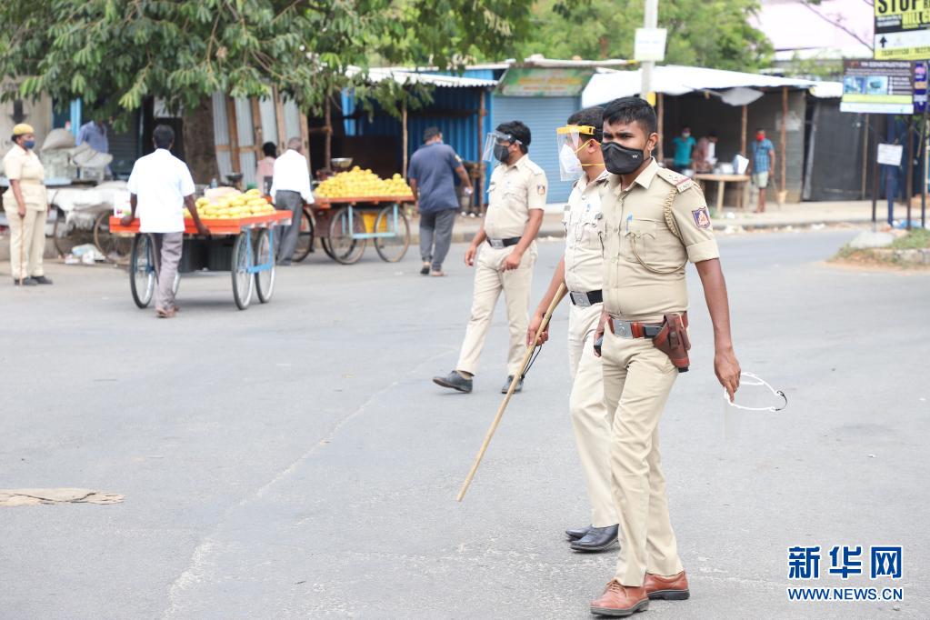5月10日,警察在印度卡納塔克邦首府班加羅爾街頭執勤。