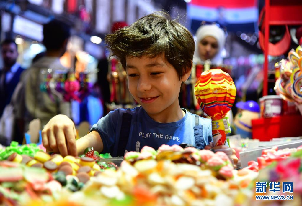 5月11日,一名兒童在敘利亞首都大馬士革的市場(chǎng)上挑選糖果。
