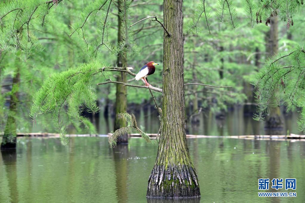5月12日,在池杉湖國家濕地公園內,鳥兒在池杉林間休息。