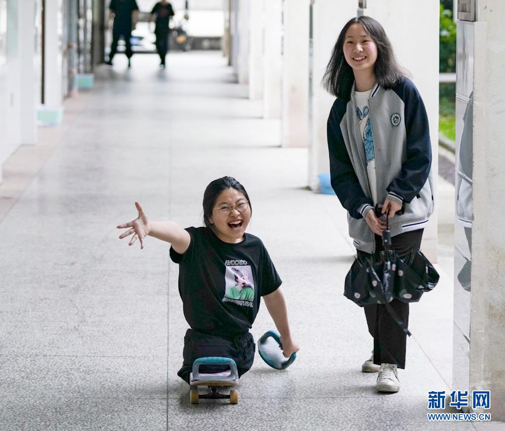 16歲的蔣張子怡是江西上饒中學高中一年級的學生。2010年一場車禍奪去了她的雙腿,如今的她只能依靠滑板代步,用雙手前行,為此,大伙都稱她“滑板姑娘”。