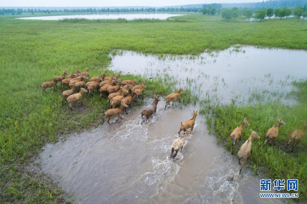 5月17日,一群麋鹿在石首麋鹿國家級自然保護區內活動(無人機照片)。新華社記者 肖藝九 攝