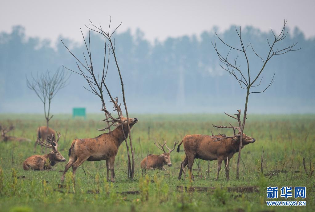 5月17日,一群麋鹿在石首麋鹿國家級(jí)自然保護(hù)區(qū)內(nèi)活動(dòng)。新華社記者 肖藝九 攝