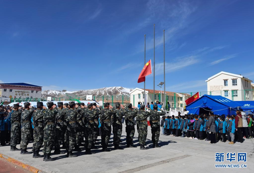 5月24日,武警青??傟牴逯ш牂C動大隊官兵與花石峽鎮藏文中心寄宿制小學的師生一同參加升國旗儀式。新華社發(宦爵才郎 攝)
