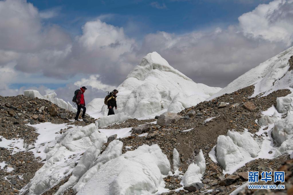 別克米爾扎·圖爾達力(右)和同伴庫爾班巴依·努爾麥麥提在適應性練習中從冰川旁經過(5月16日攝)。新華社記者 胡虎虎 攝