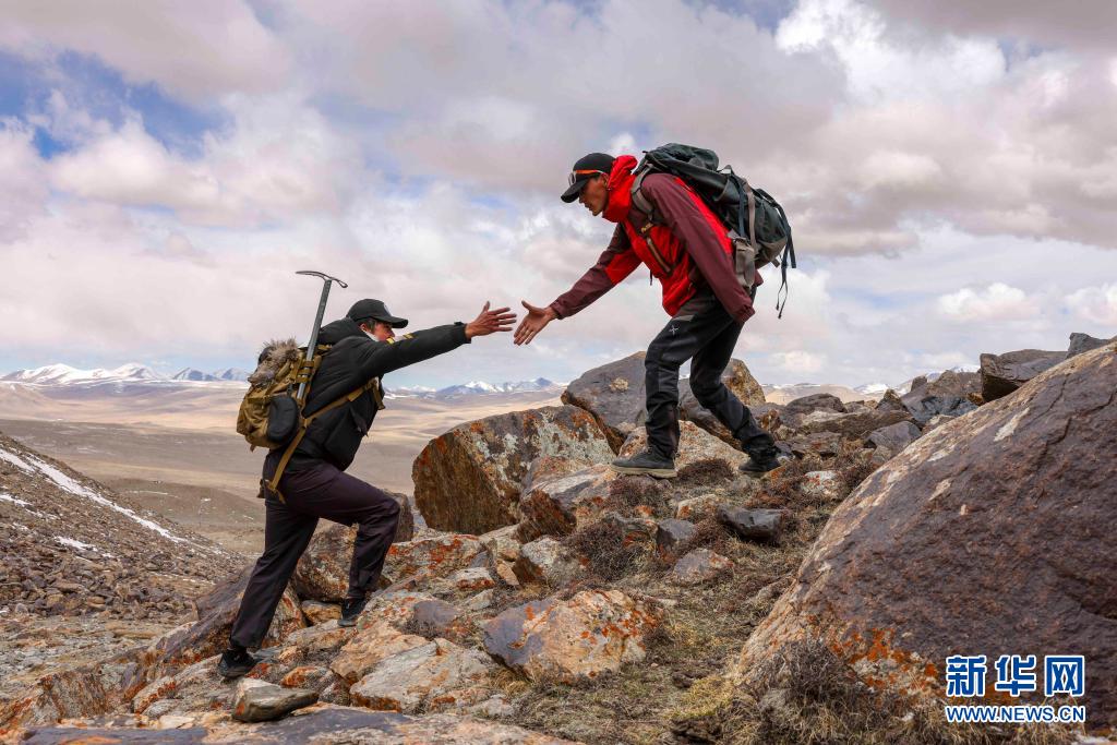 別克米爾扎·圖爾達(dá)力(左)在同伴庫爾班巴依·努爾麥麥提的幫助下跨過一段亂石密布的山路(5月16日攝)。新華社記者 胡虎虎 攝