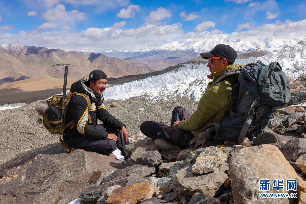 在慕士塔格峰海拔約4800米處,別克米爾扎·圖爾達力(左)和同伴庫爾班巴依·努爾麥麥提休息聊天(5月15日攝)。新華社記者 胡虎虎 攝