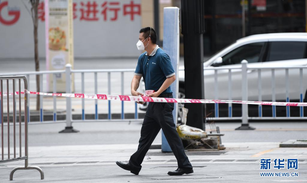 5月29日,在被納入最嚴(yán)管控范圍的廣州荔灣區(qū)白鶴洞街道廣鋼新城,物業(yè)工作人員拉起安全警戒線。新華社記者 鄧華 攝