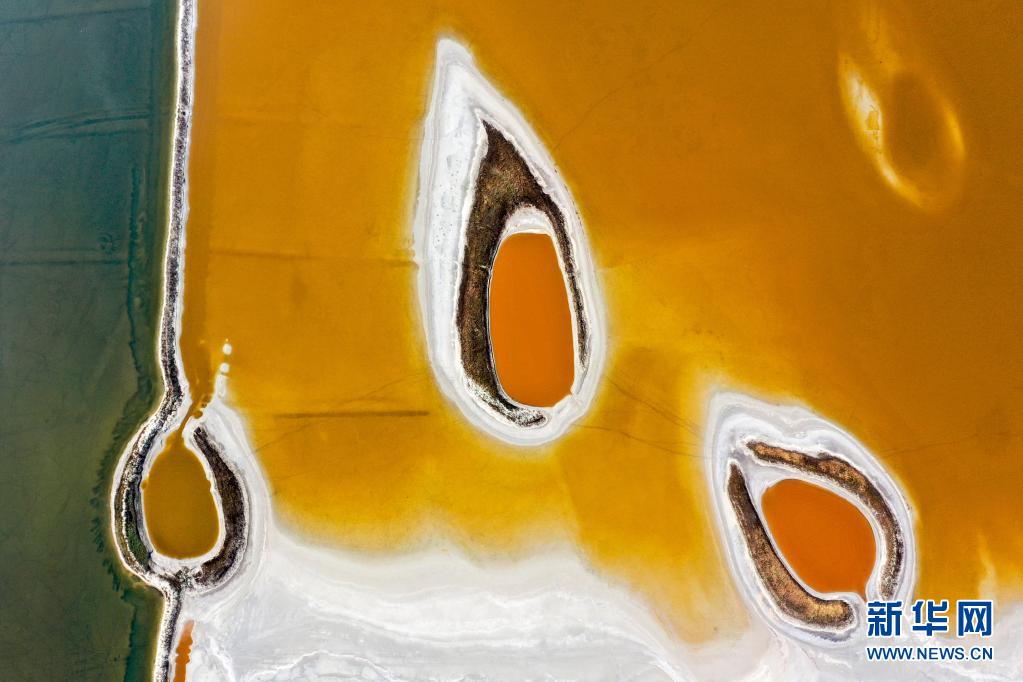 近日,隨著氣溫不斷升高,山西運城鹽湖呈現五彩斑斕的景象。