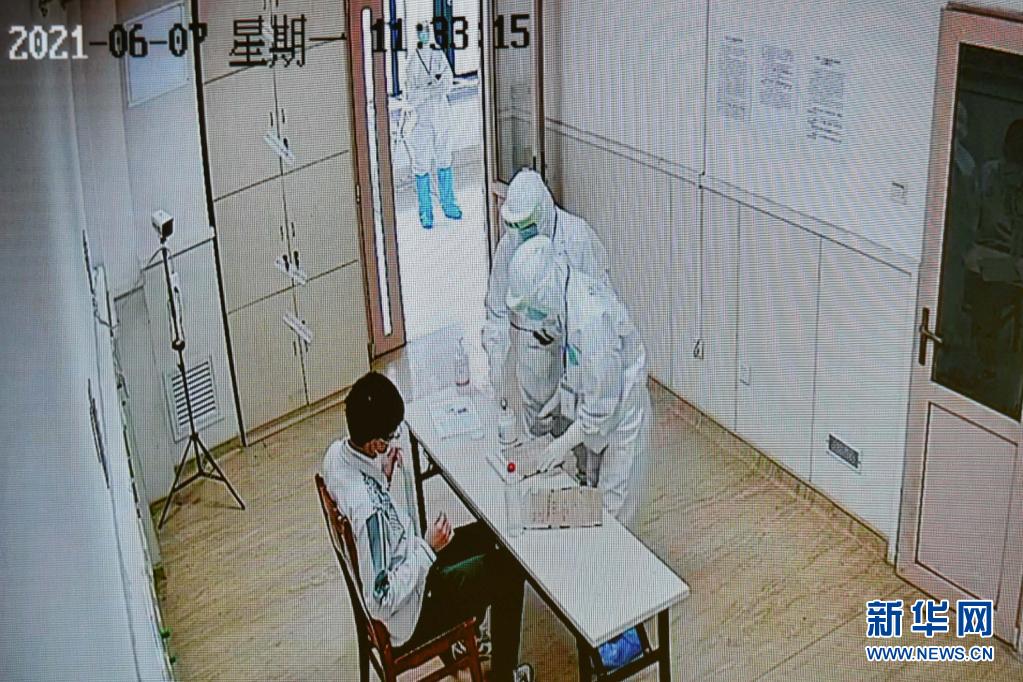 6月7日,廣東省國家教育考試指揮中心的監控畫面顯示,上午語文考試結束后,廣州市八醫院嘉禾院區醫護人員對隔離病房考生的試卷、答題卡、稿紙等用品進行消毒。新華社記者 劉大偉 攝