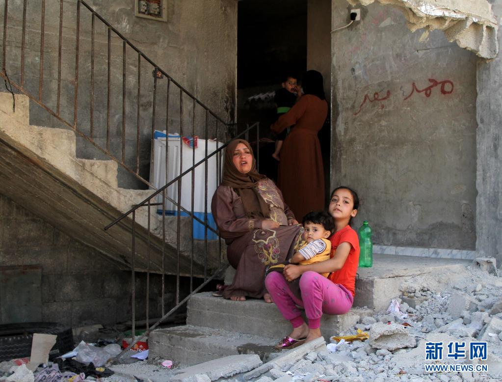 6月7日,在加沙地帶北部拜特哈嫩,巴勒斯坦人坐在遭以軍空襲損毀的建筑旁。